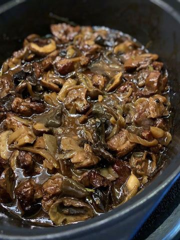 Ingredients - 50g mixed dried wild mushrooms, 3 tbsp olive oil, 1kg lamb shoulder cut into cubes, 3 medium onions roughly chopped, 2 tbsp plain flour, 14 juniper berries, 2 sprigs rosemary, leaves only roughly chopped, 2 garlic cloves crushed, 3 tbsp Fino Dark Balsamic, 350ml red wine, salt and freshly ground pepper, 200g field mushrooms sliced, 15g unsalted butter, 1 sheet pre rolled puff pastry, 1 egg beaten